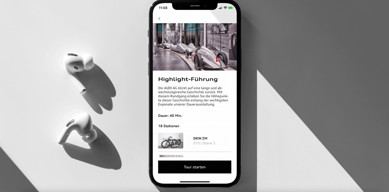 Für die Sonderausstellung „der fünfte Ring“ im Audi museum mobile in Ingolstadt entwickelten wir gemeinsam mit Who’s Mark? eine App der Sonderklasse. Sie dient als virtueller Tourguide für die Besuchenden und transportiert das Museumserlebnis auch in die eigenen vier Wände.