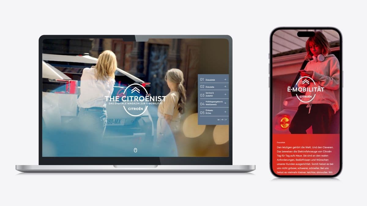 Ein digitales Magazin für Citroën gestalten und coden, das mit Mythen rund um die Elektromobilität aufräumt, die E-Modelle von Citroën richtig gut in Szene setzt und dabei auch noch Spaß macht.